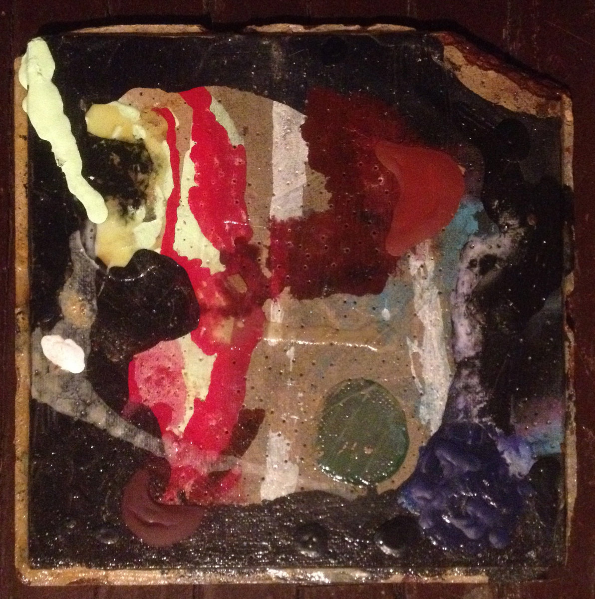 FT474 TILE CASSETTE “Melting Knowledge 1.13” painting + cassette. Rip pop and blast abstract sounds formed pop structure 'pon cassette attached to the back of 12.75" x 12.75" painting on tile. Edition 1/1.
